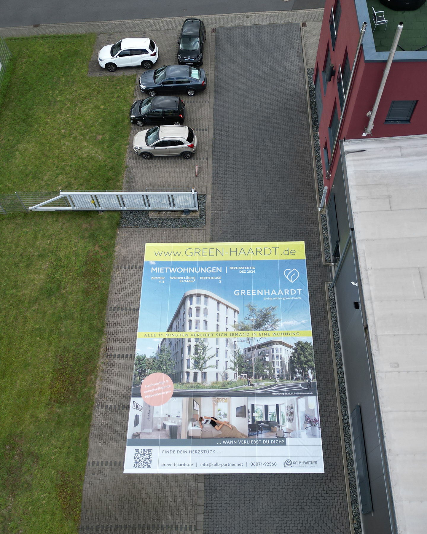 Mesh-Banner – gefertigt aus fein gelochtem Material, das leicht transparent und winddurchlässig ist. Geeignet bei stärkerem Wind, daher kommt Mesh vor allem an Fassaden oder an Gerüsten zum Einsatz.